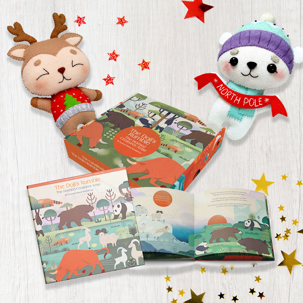 Book, tote bag, holiday stuffed toy pattern and supplies all in one beautiful gift box!